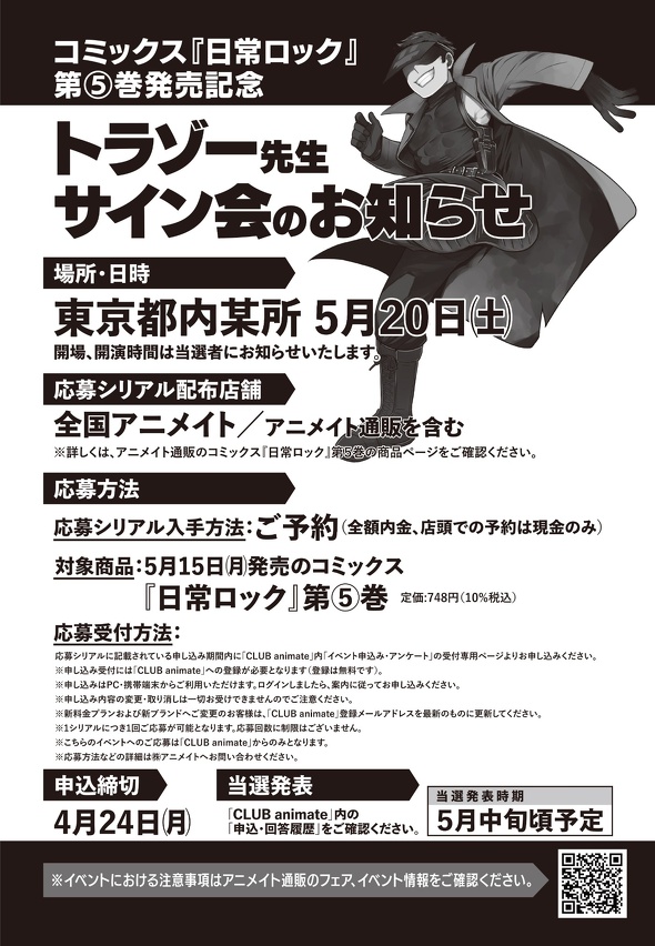 「日常ロック」⑤発売記念トラゾー先生サイン会 2023年04月13日(木) イベント情報 「日常ロック」⑤発売記念でトラゾー先生のサイン会を5月20日(土)東京都内某所で行います。 応募シリアル配布店舗:アニメイト/アニメイト通販を含む。 申込締切:4月24日(月) ※詳細は必ず添付画像をご確認ください。 なお「日常ロック」⑤は5月15日(月)発売です!