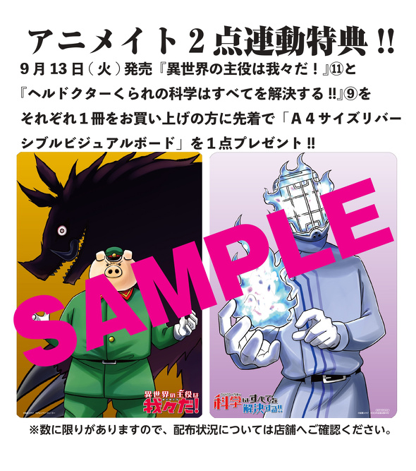 『異世界の主役は我々だ!』第11巻、『ヘルドクターくられの科学はすべてを解決する!!』第9巻【アニメイト2点連動特典】 2022年09月10日(土) 特典情報 アニメイトで9月13日(火)発売の単行本「異世界の主役は我々だ!」⑪と「ヘルドクターくられの科学はすべてを解決する!!」⑨をそれぞれ1冊お買い上げの方に先着で「A4サイズリバーシブルビジュアルボード」を1点プレゼント!! 画像の注意書きの※を必ずご確認ください。